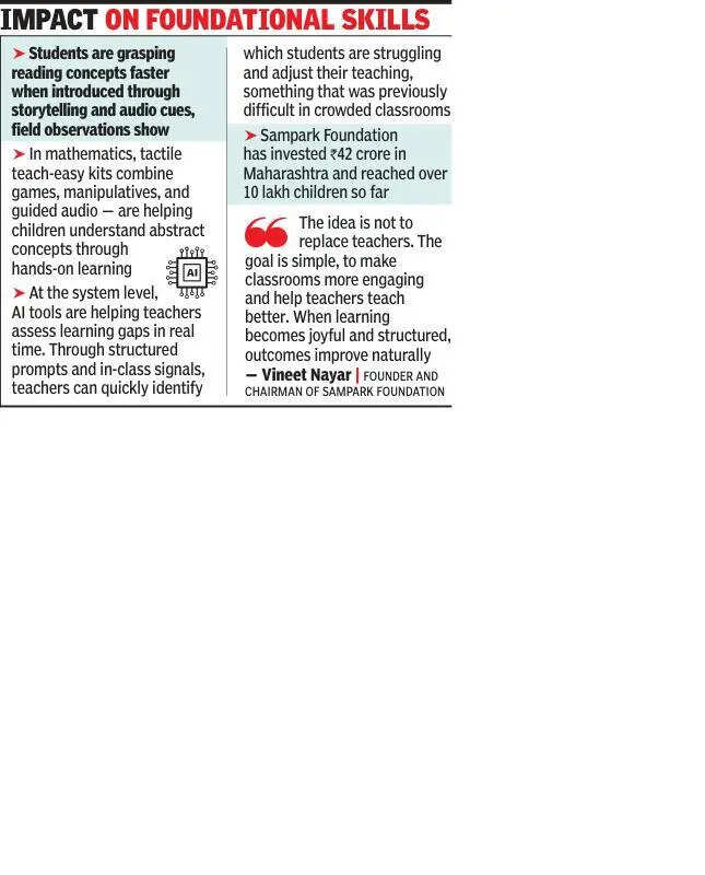 Pune: Until last year, Std III student Yash Khomne from a zilla parishad school in Marathwada rarely raised his hand to answer in class. He struggled with basic reading and often sat silently through lessons. Today, he leads his class in singing, answers questions confidently and even helps peers solve simple arithmetic problems.His transformation began when the school introduced AI-enabled tools. Yash’s classroom now has lessons with interactive videos and songs played through Sampark TV, followed by prompts from an AI-supported teaching assistant that help the teacher.Partnering with state govts to transform primary education, Sampark Foundation has introduced digital tools in govt schools designed to improve foundational learning while making teaching more effective.Built for low-resource classrooms, these tools work without internet and use videos, songs, stories, and real-time prompts to support teachers inside the classroom. Teachers get help in lesson planning, and identifying learning gaps.Across Maharashtra, similar stories are emerging. In a multi-grade classroom in Vidarbha, where a teacher manages over 35 students, structured lesson sequencing under ‘Sahi Kram, Sahi Dhang’ pedagogy has streamlined teaching. “Earlier, I spent too much time planning. Now, I know exactly what to teach and how. I can focus on the students instead,” a teacher said.At the ZP primary school in Mandovhal, a govt-run primary school in Parner block of Ahilyanagar district, student absenteeism was a challenge. With the introduction of Sampark Smart Device and Smart School App, the classrooms became engaging and joyful.School teacher Eknath Londhe said, “Attendance reached 100%, and student participation and curiosity increased. Previously inactive students became confident learners. Students started enjoying learning, asking questions, and actively participating. Teachers and parents observed a positive change. When learning becomes joyful, better attendance follows.”Shravani Gaikwad, a Std IV student, from Zilla Parishad Primary School, Sant Goroba, Kakanagar in Dharashiv, said her class likes the songs by Sampark Didi. “She teaches us in a simple way. We learn English words, solve maths, and listen to stories. Learning becomes enjoyable. The AI devices and tools have reduced our fear of maths and English,” she added.Principal secretary of the state education department Ranjit Singh Deol said, “AI can be a force multiplier when harnessed alongside pedagogy. Maharashtra welcomes the transformative role it can play in advancing our vision for quality learning with robust digital infrastructure.”The intervention comes at a critical time, when enrolment in primary schools is high but learning outcomes remain uneven. By reducing the administrative burden and offering structured, engaging content, teachers can reclaim time for actual teaching.Sampark is also deploying an AI-based, real-time classroom monitoring and governance platform, planned to be rolled out across 80,000 government schools across India.The no-cost platform will enable district, block, and school-level education officials to track teaching data, monitor classroom engagement, and predict learning outcomes, strengthening evidence-based decision-making and accountability within the public education system.