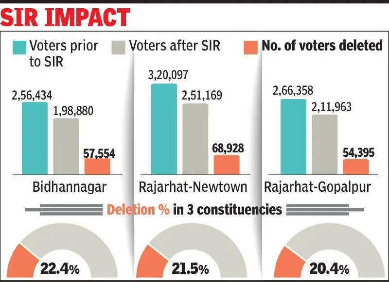 Kolkata: A sharp reduction in voter rolls across Salt Lake, New Town, Rajarhat-Gopalpur and adjoining areas under Bidhannagar Municipal Corporation post SIR has set the stage for an unusually tight contest in this year’s assembly election, with all major parties recalibrating their strategies.The SIR has led to the deletion of over one-fifth of voters in three key constituencies — Bidhannagar, Rajarhat-New Town and Rajarhat-Gopalpur — significantly altering the electoral landscape. In Bidhannagar, which includes Salt Lake and parts of New Town, the electorate has shrunk by 22.4%, with number of voters dropping from 2.56 lakh to 1.98 lakh. Rajarhat-New Town has seen a similar trend with nearly 68,928 voters — or 21.5% — deleted from the roll, bringing the total down from 3.2 lakh to 2.51 lakh.Rajarhat-Gopalpur, comprising rural pockets such as Gopalpur and Arjunpur along with urban areas like Teghoria and Baguiati, has also recorded a 20.4% drop, with 54,395 names struck off.The large-scale deletions assume significance in seats where victory margins have fluctuated sharply in recent polls. In Rajarhat-New Town, TMC won by around 9,000 votes in 2011 and 2016 before securing a landslide margin of over 56,000 in 2021. The party trailed here in the 2024 LS poll.SIR has also coincided with changes on the ground. Residents of large slum clusters such as Ghuni bustee — which the BJP alleged housed illegal Bangladeshi immigrants — have vacated the area. “The rolls have been cleaned up and fake voters removed,” said Piyush Kanodia, BJP candidate from Rajarhat-New Town.TMC alleged that genuine voters have been struck off. MLA Tapas Chatterjee said he remained confident despite what he termed as “unjust” deletions. In Bidhannagar, minister Sujit Bose faces a tougher fight. After winning by over 36,000 votes in 2011, his margins dropped to around 7,000-8,000 in last two polls. “Voters from one particular community and those from poorer sections have been targeted. Voters will respond to this on poll day,” Bose added. Rajarhat-Gopalpur has seen shifting fortunes over the years. While TMC’s Purnendu Bose won narrowly in 2016, Aditi Munshi secured a comfortable win in 2021. “I am confident of retaining the seat,” Munshi said.