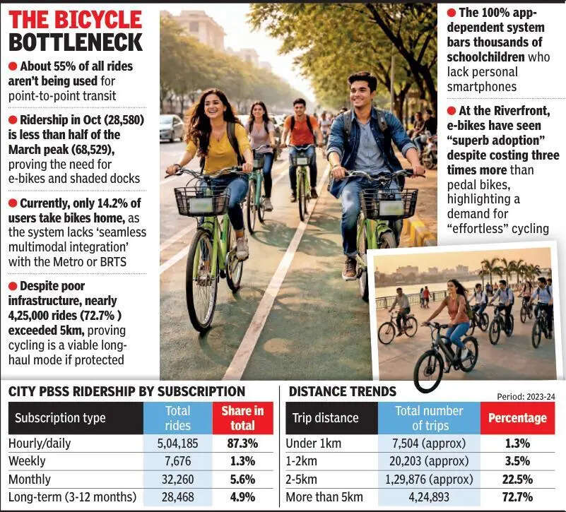 When the Commonwealth Games arrive in Ahmedabad in 2030, the city will face a basic challenge — how to move large numbers of people across congested roads in sweltering heat. Public cycling was seen as part of the solution. For now, however, the city’s Public Bicycle Sharing System (PBSS) remains largely confined to leisure riding rather than everyday commuting.A 2025-26 academic study, ‘Ridership Analysis of the Public Bicycle Sharing System in Ahmedabad’, shows why. Over one year, the city logged 5.77 lakh PBSS trips across 253 docking stations. More than half of those rides — 3.17 lakh, or 55% — involved no actual movement from one station to another. Riders borrowed a bicycle and returned it to the same dock, a pattern researchers classify as “zero displacement”.The study was conducted by Tothad Sattarsad Shagufta, Dimpu Byalal Chindappa and Seelam Srikanth of the School of Civil Engineering at REVA University in Bengaluru. It found that short-term hourly and daily passes account for 87.3% of all trips, while longer subscriptions of three to 12 months make up just 4.93%, clearly showing the system’s tilt toward “occasional use”.“Leisure trips happen because that’s when the roads are devoid of traffic,” said Arjit Soni, founder of MYBYK, the sole PBSS operator in Ahmedabad, which manages a fleet of over 10,000 bicycles. The system performs poorest during the morning rush between 6am and 9am — a window that still accounts for 30% of daily ridership — when traffic and safety concerns deter regular commuters. To address gaps, MYBYK has begun placing electric bicycle docks inside offices and residential societies to tackle first-mile connectivity.Cost is another barrier. A standard pedal bicycle costs Rs 50 per trip, while an electric cycle costs Rs 150 for just 15 minutes. A transport expert attributed the pricing “to the absence of govt subsidies, pointing out that operators must install digital hardware on every cycle for tracking and access”. Without financial support from the city, he said, “the system remains out of reach for many potential users”.PBSS access is also smartphone-dependent, excluding school students and others without app access. Soni has urged the Ahmedabad Municipal Corporation to integrate PBSS with the National Common Mobility Card and absorb part of the revenue risk. One proposal would bundle a Rs 20 BRTS ticket with a Rs 10 add-on allowing 12 hours of bicycle use.Weather patterns further shape ridership. Usage peaks at 68,529 rides in March but drops to 32,154 in Aug during monsoon. Yet, the study highlights untapped potential. Nearly 73% of trips — over 4.24 lakh rides — already exceed 5km, suggesting strong commuter demand. For Soni, however, infrastructure remains decisive.