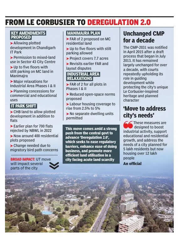 Chandigarh: In one of the most far-reaching urban planning shifts in a decade, the Chandigarh administration has finalised major amendments to the city’s master plan, paving the way for transformative changes in land use, building norms and development controls across key zones.The proposals — to be sent to the Ministry of Home Affairs (MHA) for approval — include allowing plotted development in the Chandigarh IT Park, mixed-land use in the Sector 43 City Centre, up to five floors with stilt parking on municipal corporation land in Manimajra, and major relaxations for industrial areas Phases I and II. Planning concessions for commercial establishments and educational institutions are also part of the overhaul.Officials said the push aligns with the Centre’s focus on optimising land use in a city grappling with rapid population growth and shrinking availability of developable land. Large tracts under the Chandigarh Housing Board (CHB) in the IT Park are expected to be unlocked. “In addition to the existing permission for the development of flats, the provision for plotted development will also be added,” said a senior UT official.CHB plans for multi-storey residential projects hit the environmental clearance wall in 2022. The National Board of Wildlife (NBW) rejected the proposal for the multi-storey housing project as it fell in the “migratory bird path”. The NBW also reasoned that the waste generated, along with the noise and air pollution arising as a result of allied activities in the proposed townships, would have deleterious effects on the sanctuary and birds.“The CHB plan was to construct 700 flats on around 16.6 acres of land in two pockets, plots 1 and 2 at IT Park. Now, the CHB plans to have around 400 plots in the area. For this, master plan changes are required,” said the official.Changes in the master plan itself will be made for allowing floor area ratio (FAR) of 2 and up to five floors with stilt parking on MC land in Manimajra. Earlier, there was major controversy over the permitted FAR and layout plans. Residential projects are planned to be developed on a 7.7-acre plot in Manimajra.The CMP will also see changes for permitting a FAR of 2 for the Industrial Area phases I and II for all categories of plots. Further relaxations regarding the mandated coverage area and open areas are proposed to be incorporated. Also, proposals to allow nearly double the coverage area than existing for the labour housing within the industrial plots (from 2.5% to 5%) are also being proposed, though the caveat is that no separate dwelling units can be constructed in this area.This move comes amid a strong push from the central govt to advance “Deregulation 2.0”, which seeks to ease regulatory barriers, enhance ease of doing business, and promote more efficient land utilisation in a city facing rapid population growth and acute land scarcity.“These measures are designed to boost industrial activity, support educational and residential development, and unlock stalled projects in a city originally planned for 5 lakh residents but now grappling with over 12 lakh people and heavy reliance on rental housing,” said the official.The CMP-2031 was notified in April 2015 after a draft process that began in July 2013. It has remained largely unchanged for over a decade, with courts repeatedly upholding its role in guiding development while protecting the city’s unique Le Corbusier-inspired heritage and planned character.According to the administration, a draft proposal for the amendments will first be placed in the public domain. Stakeholders, residents and the general public will have the opportunity to examine the changes, submit suggestions and raise objections. The proposal will also undergo scrutiny by a select committee of experts before being forwarded to the MHA for final approval. “The draft proposal will be put in public domain after the nod from the competent authority,” said the official.Centre Pushing For Deregulation 2.0KEY PROPOSALSPlotted development allowed in Chandigarh IT ParkMixed-land use permitted in Sector 43 City CentreUp to five floors with stilt parking on MC land in ManimajraMajor relaxations for Industrial Area Phases I & IIPlanning concessions for commercial and educational usesIT PARK SHIFTCHB land to allow plotted development in addition to flatsEarlier plan for 700 flats rejected by NBWL in 2022Now around 400 residential plots proposedChange needed due to migratory bird path concernsMANIMAJRA PLANFAR of 2 proposed on MC residential landUp to five floors with stilt parking allowedProject covers 7.7 acresRevisits earlier FAR and layout disputesINDUSTRIAL AREA RELAXATIONSFAR of 2 for all plots in Phases I & IIReduced open-space norms proposedLabour housing coverage to rise from 2.5% to 5%No separate dwelling units permittedWHY NOWPart of Centre’s push under ‘Deregulation 2.0′Aim to ease regulations, boost ease of doing businessCity planned for 5 lakh now houses over 12 lakh residentsAcute land scarcity and rental housing pressureUnchanged CMPThe CMP-2031 was notified in April 2015 after a draft process that began in July 2013. It has remained largely unchanged for over a decade, with courts repeatedly upholding its role in guiding development while protecting the city’s unique Le Corbusier-inspired heritage and planned character.“These measures are designed to boost industrial activity, support educational and residential growth, and address the needs of a city planned for 5 lakh residents but now housing over 12 lakh people,”An official