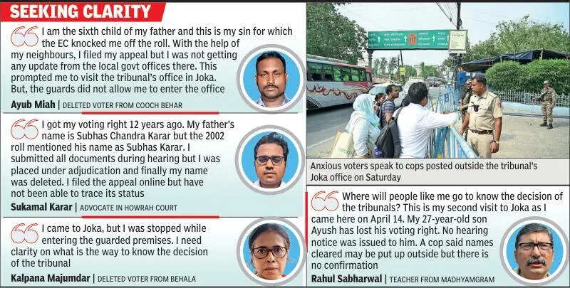 Kolkata: Running from the pillar to post to know about the status of their appeals made after deletion of names, many ‘deleted’ voters, including advocates, knocked on the door of justice at Dr Syama Prasad Mookerjee-National Institute of Water and Sanitation (SPM-NIWAS), Joka, on Saturday, but they could neither walk into the “prohibited zone” nor get answers on how to access the report cards that will be released by the tribunal authority.Most of these electors had visited several govt offices to follow up their appeals, and had been directed to the tribunal. While trying to enter, they were shooed away from the office for being “trespassers”.Among those who visited the Joka office was daily wager Ayub Miah, 33, a ‘deleted’ voter who travelled around 713 km from Cooch Behar to enquire about his right as his home town will go to poll on April 23. “I am the sixth child of my father and this is my sin for which the EC knocked my name off the roll. But my visit was of no use. The security guards did not allow me to enter the office,” he rued.Sukamal Karar and Naznin Khatun, both advocates at Howrah Court, visited the DM and SDO’s offices in the morning but did not find any clarification about the response to their appeals. The officials sent them to the tribunal’s office, but they could not access anything. “I got my voting right 12 years ago. My father’s name is Subhas Chandra Karar but the 2002 roll mentioned his name as Subhas Karar. When I was called for hearing earlier, I submitted all documents but I was placed under adjudication and finally my name was deleted. I filed the appeal online but have not been able to trace its status. None has any definite answer while the cops and central force guarding the office did not let me enter,” said Karar, a resident of Shibpur constituency. The security guards stated they have been instructed not to allow anyone inside the institute where the tribunal authority is going through the appeals. “As per directions, we can let in only those who will show a notice from the tribunal authority. Entry of others is prohibited,” said a security personnel.Madhyamgram resident Rahul Sabharwal, who teaches at a private institute, drove about 40 km for over an hour to reach Joka to know whether his son Ayush will be able to vote. But he could barely spend a minute outside the office as the security guards drove him away, replying that they were instructed not to let in the applicants. “Where will people like me go to know the decision of the tribunal authority? This is my second visit to Joka as I came here on April 14. My 27-year-old son Ayush has lost his voting right. No hearing notice was issued to him, and none told us if any document other than the ones submitted was needed. The names of mine and my wife are there on the rolls. One of the cops said that names cleared may be put up outside but there is no confirmation on this,” said Sabharwal.Khatun, also the notary officer at the court, rued, “The second-phase poll is 11 days away, so I came to know whether the appellate tribunal authority has cleared my name for restoration of voting right. But there is no way to find the status of appeals. None has any answer here. This is nothing but harassment. The BLO did not give me any hearing notice after the enumeration phase. The reason behind deletion has not been communicated to me. Have I been victimised for my religion?”