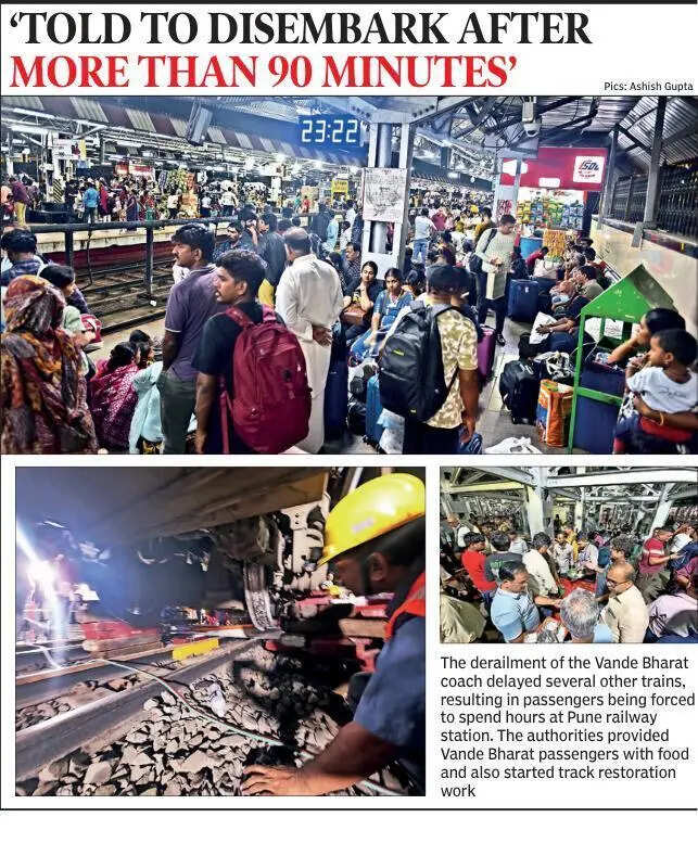 Pune: Solapur-bound passengers of derailed Vande Bharat Express spent anxious moments on a platform of Pune Junction till late in the night on Monday, as the railway authorities decided to send them to their destination in the rake of delayed Deccan Queen.Hemant Kumar Behera, the divisional commercial manager and the PRO of Pune railway division, said, “Passengers waiting to go to Solapur will be sent in Deccan Queen’s rake. It will take sometime before the train arrives because track restoration work is under way after the derailment of Vande Bharat Express.”The scheduled arrival time of Deccan Queen in Pune is 8.25pm. Till going to press, the train had not reached the city.Almost one-and-a-half hours after a part of C-15 coach of CSMT-Solapur Vande Bharat Express (22225) derailed about 600 meters away from the platform, passengers came walking to platform number two (sharing with three) of Pune station. Some passengers sat on the platform, while a few took rest on the staircase of a foot overbridge. They were served food there. Mumbai’s Jamil Sayyed, travelling on C-6 coach of the train, said, “My daughter and I were going to Solapur. We kept sitting in the train till around 8.50pm. Railway officials then announced that Pune-bound passengers should disembark and those travelling to Solapur should remain seated.”“After some time, the officials said this train wouldn’t go and passengers going to Solapur should also disembark. It took us around half-an-hour to reach the platform. We have been told that a train will come in sometime for us,” Sayyad told TOI.