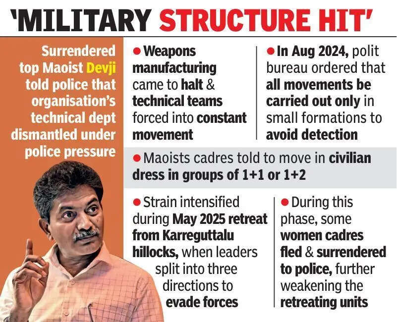 Hyderabad: Surrendered senior Maoist leader Tipiri Thirupathi alias Devji has told the Telangana police that the outfit’s last attempts to survive Operation Kagar collapsed under the twin strain of military setbacks and political disarray, with sustained security pressure breaking its core operational capacity, even as internal divisions slowed decision-making at a critical stage.According to Telangana police sources, Devji said the pressure on the ground forced the Maoist leadership to scale down movements into small formations, suspend arms manufacturing, and retreat through fragmented escape routes that left cadres exposed. He also pointed to low morale, disputes among senior leaders, and the absence of a clear strategy on whether to press on, seek a ceasefire, relocate ageing cadres, or even dump weapons.Military structure hitDevji told the police that the organisation’s technical department was dismantled under police pressure. As a result, arms manufacturing came to a halt, and technical teams were forced into constant movement. He said the polit bureau, in Aug 2024, ordered that all movements be carried out only in small formations to avoid detection by security forces. Cadres were instructed to move in civilian dress in groups of 1+1 or 1+2. The strain intensified during the May 2025 retreat from the Karreguttalu hillocks, when leaders split into three directions to evade central forces. During this phase, some women cadres fled and surrendered to the police, further weakening the retreating units.Retreats exposed gapsAccording to police sources, Devji described severe communication failures during the retreat towards the National Park area. Teams faced delays in receiving leaders due to breakdowns in communication, affecting coordination at a time when the leadership was already under pressure. While camped in the National Park, the leadership learned of the death of general secretary Nambala Keshava Rao alias Basvaraj, he said. Attempts to regroup were followed by further losses, including top Maoists Sudhakar and Mylarapu Adellu in exchanges of fire. The account suggests that once the retreat phase began, the movement was unable to maintain cohesion between teams, leaders and fighters, turning withdrawal into a series of uncoordinated moves under pressure.Internal divisionsDevji also told the police that military setbacks were compounded by internal divisions within the leadership. He referred to friction between leaders from Chhattisgarh and those from Telangana or the Andhra-Odisha Border, with some Chhattisgarh leaders resenting the movement of Telangana and AOB cadres and, at times, refusing them shelter.He said morale within the party had declined sharply due to ideological differences and disputes among central committee members. At the same time, decision-making was slowed amid disagreement over the survival strategy. While one view favoured dumping weapons and staying in villages, another insisted that arms be retained for self-defence.The lack of clarity extended to the political line as well. Devji said there was no consensus on how to respond to the failure of mass movements, declining student recruitment, and a situation in which more people were being drawn towards govt reforms. According to police sources, he said the polit bureau in 2024 issued a circular directing that elderly and ailing cadres be moved to safe locations or encouraged to surrender to police if shelter could not be secured.He also said the party’s economic policy was to retain funds for a maximum of three years, mainly in the form of gold coins, to preserve what remained. Devji further stated that a 2018 central committee decision to withdraw forces from Chhattisgarh to other regions was never fully carried out, leaving cadres exposed to the full force of Operation Kagar.