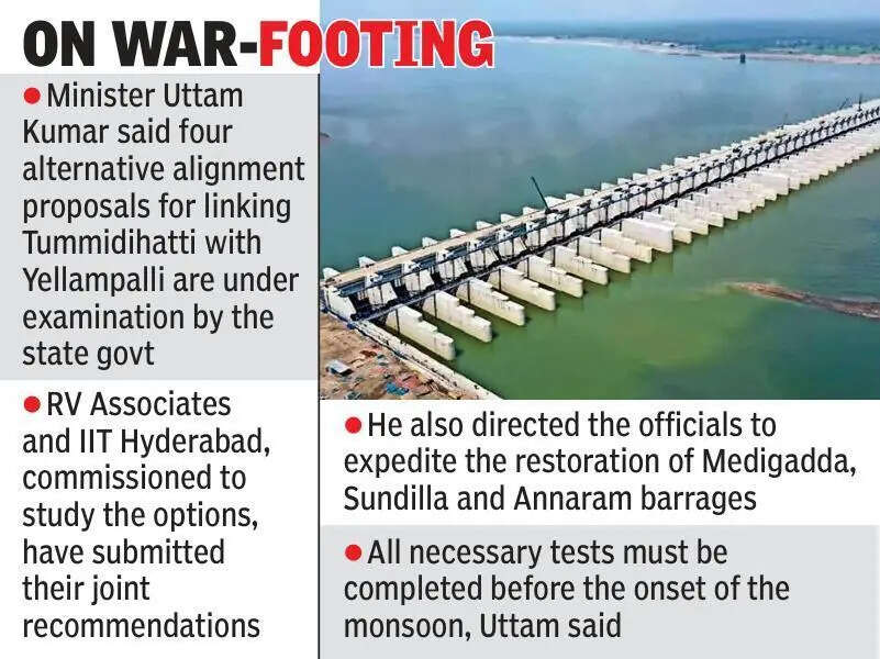 Hyderabad: The Telangana govt will initiate a dialogue with the Maharashtra govt to resolve the outstanding issues and take up the construction of a barrage at Tummidihatti as part of the Pranahita-Chevella project.Chief minister A Revanth Reddy instructed the irrigation officials to start preparations to hold talks with Maharashtra, seeking permission to construct the barrage at a height of 150 metres.At a high-level meeting at MCRHRD Institute, the officials and irrigation experts suggested that constructing the Tummidihatti barrage at a height of 150 metres would enable the utilisation of at least 100 tmcft of water and fulfil the interests of Telangana.The authorities said that Maharashtra already agreed to the construction of the barrage at a height of 148 metres. Engineering experts noted that building the barrage at 152 metres would result in more submergence in Maharashtra territory, and hence the height of 150 metres would help to draw water at a lower cost.In the PowerPoint presentation, the officials brought to the attention of the CM key aspects such as the optimal height for constructing the Tummidihatti barrage and the volume of water that could be utilised based on different construction heights.The irrigation officials also apprised the CM that the govt spent approximately 11,000 crore on the Pranahita-Chevella project, and canal construction has been completed in several areas. Also, 71.5 km of canal work has already been executed.CM Revanth Reddy stressed that the construction of the barrage at 150 metres height would not significantly affect the submergence of areas in Maharashtra and also assured that the govt is ready to provide compensation to the displaced.The barrage would ensure the availability of water for both irrigation and drinking needs in the upland regions of Telangana, including Adilabad. The CM emphasised that the barrage should facilitate water flows to Sripada Yellampalli Reservoir via gravity flow at a minimal cost.In view of the BJP govt in Maharashtra, CM Revanth instructed minister Uttam Kumar Reddy to immediately write a letter to Kishan Reddy, requesting him to persuade the Maharashtra govt and safeguard Telangana interests.Reviewing the progress of the restoration of Medigadda, the Chief Minister ordered the officials to expedite the completion of the geo-testing operations for Medigadda barrage and complete the works before the start of the monsoon season.Earlier during the day, minister Uttam said four alternative alignment proposals for linking Tummidihatti with Yellampalli are under examination by the state govt. RV Associates and IIT Hyderabad, commissioned to study the options, have submitted their joint recommendations, which are now being scrutinised for feasibility, cost and efficiency.“The Congress govt is fully committed to the construction of the Pranahita-Chevella project in line with the promises made in its election manifesto. Each proposal is being examined in detail for its cost, advantages and disadvantages. A final decision will be taken after a review meeting with the CM in the evening,” Uttam said.He also directed the officials to expedite the restoration of Medigadda, Sundilla and Annaram barrages. “All necessary tests must be completed before the onset of the monsoon. The Standard Penetration Tests (SPT) must be conducted every 1.5 metres. The permeability tests must be carried out every 3 metres. Even if the bore drilling taken up as part of the exercise hits rock, the holes must be drilled at least 5 metres deep. The coordination committee appointed for barrage restoration works should visit the sites immediately and fix a clear timeline,” he added.