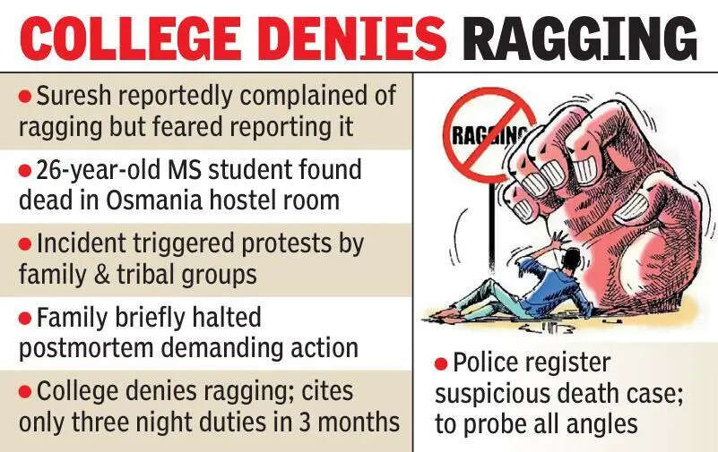 Hyderabad: Mother of first-year postgraduate medical student K Suresh on Friday alleged that sustained harassment may have led to his death at Osmania Medical College, claiming that her son had recently complained of ragging by senior students but feared reporting it.“My son was not someone who would die by suicide out of fear. He recently told us over the phone that some seniors were ragging him. When we said we would come there and speak, he asked us not to, saying the harassment would only increase if a complaint was made,” Nagamani said, demanding a thorough investigation.The allegation came a day after the 26-year-old MS General Surgery student was found dead in his hostel room under suspicious circumstances on Thursday, triggering protests by family members and tribal organisations at Osmania General Hospital the same day. Family members and tribal community leaders gathered near the mortuary and, for some time, prevented officials from shifting the body for postmortem, insisting that action be taken against those responsible. Police later intervened, pacified the protesters, and conducted the autopsy under tight security.‘Back-to-back shifts’Nagamani also alleged that her son was made to work back-to-back shifts, including night duties. However, Osmania Medical College principal M Raja Rao told TOI that in the last three months since Suresh joined, he had worked only three night duties, with the rest being day shifts. “There is no such thing as ragging in the college, and that too in postgraduate studies, no chance,” the principal said.Rao also said an inquiry committee had been constituted into the incident, headed by Gandhi Medical College principal Dr K Indira. Afzalgunj police said a case of suspicious death had been registered based on a complaint filed by Nagamani. Investigators said all angles, including allegations of ragging, academic stress, and mental health concerns, were being examined.Suresh hailed from Bheemlagani Thanda in Kurvapally panchayat of Jadcherla mandal in Mahabubnagar district. He was the elder son of Ramchander and Nagamani and had completed his MBBS from a private medical college in Mahabubnagar before joining the postgraduate programme at Osmania around three months ago.Investigating officer SI M Subhash said Suresh had wanted to pursue postgraduate studies in General Medicine but joined General Surgery after securing a lower rank. He was reportedly unhappy with the course allotment and had been under emotional stress in recent weeks. He added that Suresh had been consulting a psychiatrist in Banjara Hills and was on medication.