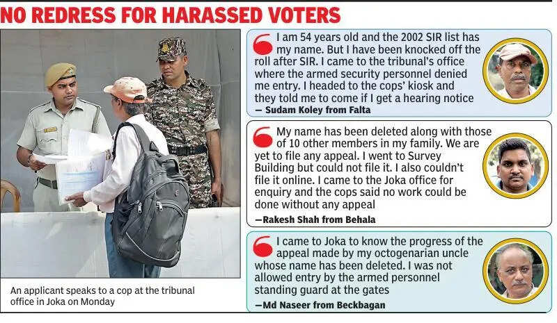 Kolkata: Cops posted outside the tribunal office in Joka have turned counsellors for voters whose names have been knocked off during the SIR of electoral roll. Debarred entry into the campus of SPM-NIWAS where the tribunal authority is going through their appeals, these people are unable to speak with the officials. Absence of a help desk has prompted them to make a scramble to the cops’ kiosk for seeking clarity on whether they will be allowed to vote in the upcoming assembly poll.On Monday, cops addressed a series of their queries, including “will I be able to cast vote in this election”, “has my appeal reached the tribunal”, “when will the tribunal’s decision be known” and “do I need to come here again to know if my name has been cleared”.Even though various tribunal-related questions keep coming from the anxious electors to the police personnel at the kiosk, the latter have “limited answers and knowledge” about what’s going on inside. “We have not had any guideline about how to deal with the electors sent to the tribunal’s office either by their BLOs or other people, including neighbours or the agents of political parties who also visited their houses during the SIR enumeration phase. And these people don’t know that unless summoned, none will be allowed inside. We’re feeling bad because they are coming here in the scorching heat and some of them are travelling from distant places,” said a cop.When Beckbagan resident Md Naseer and Falta resident Sudam Koley sought police assistance outside the tribunal’s office on Monday, cops asked them to come if they get a hearing notice from the tribunal. “As per the instruction given to us, only the attendees of summons will be allowed in. We heard that notices will be issued to those whose supporting documents for appeals are not satisfactory. We are telling everyone to come only if they receive summons,” police said.Naseer came on behalf of his octogenarian uncle Md Khaleed, whose name has been deleted. “His name is there on the 2002 SIR list, but it was not there in the electoral roll published on Feb 28. What is the reason behind this deletion? The officials did not meet as security guards shooed me away. I sought cops’ help, but they also needed clarity on this matter,” he said.Behala resident Rakesh Shah and 10 members of his family faced SIR deletion but could not file an appeal. He came to the tribunal with documents, and cops guided him to file the appeal immediately.