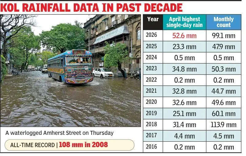 Kolkata: A series of nor’westers through Wednesday night gave the city its second wettest April day in around 15 years. While the Met office did not rule out a few more spells of thundershower, albeit of less intensity, in the next few days, a special IMD bulletin issued an orange alert for thunderstorm in the city and a few neighbouring districts on Monday, the counting day for Assembly elections.“We expect a few more spells of thunderstorm in the next few days, but with lower intensity. On Monday, however, there could be intense thunderstorm activities in Kolkata, North and South 24 Parganas, Howrah, Hooghly, East and West Burdwan, Bankura and West Midnapore,” said H R Biswas, head of the Regional Meteorological Centre (RMC), Kolkata. The IMD’s orange thunderstorm alert for North and South 24 Parganas, Howrah and West Midnapore begins from Sunday when a few places are likely to face lightning and gusty wind.An intense thunderstorm that started pounding on Wednesday night went on till well past midnight. The Alipore Met office recorded 52.6 mm of rain between Wednesday and Thursday morning, most of it happened during the first two hours, leaving various pockets of the city under water. This is the second-highest single-day rain in the city for April since 2011, after 63.7 mm of rain on April 6, 2012. In 2025 it was only 23 mm while in 2024 and 2023 it was 0.5 mm and 34.8 mm, respectively. This April the city has got a monthly total rain of 99.1 mm, way above the normal monthly rain count. This is the third-highest April rain since 2011. In April 2025 it was 47.9 mm. “April’s rain count for Kolkata is about 74% above the normal mark. Apart from Malda and Murshidabad, all districts of Bengal have got either surplus or normal rain count this month due to frequent thunderstorm spells,” said the RMC Kolkata head. The bumper 24-hour rain also dragged the maximumdown to 28.2° on Thursday, which was 7.4 notches below normal, the lowest day temperature in more than a month. On Wednesday it was 32.2°. The minimum also plummeted 20.4°, which was again a whopping 5.8° below normal. This again was the lowest in about three weeks. Due to the frequent thundershowers, the highest maximum this month, which was 36.8° on April 23, remains the lowest for April in the past one-and-a-half decade.“Next few days the temperature will be on the lower side to make the heat tolerable,” added Biswas.