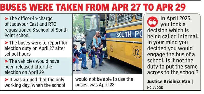 Kolkata: Calling the state’s requisition of eight buses of South Point High School for election duty “arbitrary”, the Calcutta High Court on Thursday quashed the requisition order under Section 160 of the Representation of the People Act, which gave the state the power to requisition “any” vehicle for polls.The officer-in-charge of Jadavpur East and RTO had requisitioned the eight school buses, which were ordered to report to duty on April 27 after school hours. The vehicles were to be released after the election, which will take place on April 29. It was argued that the only working day for schools would be April 28.Justice Krishna Rao said, “In April 2025, you took a decision which is being called internal. In your mind you decided you would engage the bus of a school. Is it not the duty to put the same across to the school? If the section gives power then the notification of March 2026 is not required. Then you made a decision and passed several orders.”The school’s counsel, Biswaroop Bhattacharyya, urged, “Kindly exempt us. We have a running school. These are junior section buses.” He said though the order of requisition was of March 11, the South Point principal made a representation for exemption on March 31. The school started the new session on April 6 and it was argued that if the buses were requisitioned, students would suffer.The state counsel submitted that Section 160 of the Representation of the People Act said that for elections, the govt could requisition any vehicle, including public. An educational institute bus (school bus) is covered under Section 2(47) of the Motor Vehicles Act, 1988, which defines it as a “transport vehicle”. It was also submitted that 105 CAPF companies, each with at least 90 personnel, were stationed in the Kolkata Police jurisdiction. According to the EC notice and due to shortage of vehicles, the school buses were requisitioned, the state counsel said, adding vehicles were also required to ferry election officers.The counsel appearing for the DEO submitted that there was no need to inform a school before requisitioning its buses, only the order of requisition had to be sent.The HC may have spared the South Point buses election duty, private operators were not as lucky. According to Arupam Dutta of Poolcar Owners’ Welfare Association, 15 of their pool cars have been taken for election duty. “Even on Thursday, two South Point pool cars were stopped on road and requisitioned. We are asked to send the cars from April 25. Some have been requisitioned from April 27. We have told parents that we cannot provide services till April 30,” said Dutta.Anurag Agarwal, representing West Bengal Contract Carriage Owners and Operators Union, said, “Services for 17 schools are being disrupted. They are asking us for 350 buses for Malda and Jangipur between April 20 and 24 and another 900 between April 27 and 30. That will mean services to all DPS schools, New Town School and Birla High among others.” DPS Newtown principal Ambica Mehra said, “If buses are taken, we will have to shift to online classes.” Around 90 buses of the school are outsourced to a private operator. The Heritage principal Seema Sapru said, “So far, no bus has been taken. But such an order will help as without buses, we may even have to shut the school.”