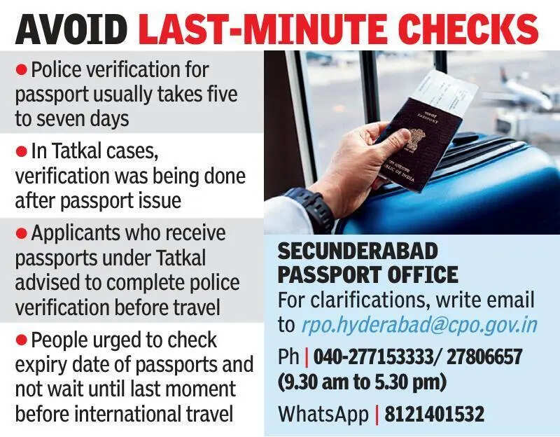 Hyderabad: A special passport drive will be conducted on May 9 to clear appointment pendency in Telangana, regional passport officer (RPO) J Snehaja said on Tuesday.Snehaja said 4,000 appointment slots would be opened across five Passport Seva Kendras (PSKs). Of these, 3,100 slots would be made available at Hyderabad PSKs in Begumpet, MGBS Metro and Raidurg, while Karimnagar and Nizamabad would get 450 slots each.Summer rush pushes cycle to 8-12 daysThe RPO said passport appointment pendency has increased due to the summer rush, with many people applying ahead of travel plans. The current appointment cycle was around 8 to 10 days, while at the Hyderabad, Karimnagar and Nizamabad PSKs, it was around 8 to 12 days.She said the special Saturday working on May 9 is expected to reduce the appointment cycle by two to three days, bringing the waiting time down to 5 to 7 days after the drive. The slots will be released on Tuesday night, allowing applicants to book fresh appointments or reschedule existing ones. “This will also help applicants who can come only on weekends,” she said. Applicants can log in to www.passportindia.gov.in.Karimnagar PSK capacity to be doubledSnehaja said the recently relocated PSK at Karimnagar would increase its daily appointment capacity from May 4. The centre, which was currently handling 220 appointments a day, would handle 400 appointments daily.The number of normal appointments would go up from 160 to 310, Tatkal from 40 to 60, and police clearance certificate appointments from 20 to 30.She said the PSK operating from MGBS Metro station was doing well, and Telangana was the first state in the country to have such a facility. Thursday adalats were also helping dispose of 800 to 1,000 applications.Tatkal passports dispatched same dayThe RPO said Tatkal passports and passports in genuine medical emergency cases were being issued the same day.She clarified that passports were not handed over directly to applicants but were dispatched to their registered address. “The postal department is able to deliver passports within a day in Hyderabad and within three to four working days in rural areas,” she added.Police verification usually takes five to seven days. In Tatkal cases, verification was being done after passport issue. Snehaja advised applicants, who receive passports under Tatkal, to complete police verification before travelling or leaving their place of residence.She urged people to check the expiry date of their passports and not wait until the last moment before international travel. She said e-chip passports were now being issued for fresh and renewal cases, but existing old passports remain valid until renewal.Snehaja said summer holidays were driving increased demand for passports. She added that if demand continues to rise, additional special drive days might be scheduled.The email address of the Passport Office at Secunderabad has changed to rpo.hyderabad@cpo.gov.in. Applicants could contact the office on 040-27715333, 27715115 and 27806657 between 9.30am and 5.30pm. The WhatsApp number is 8121401532.