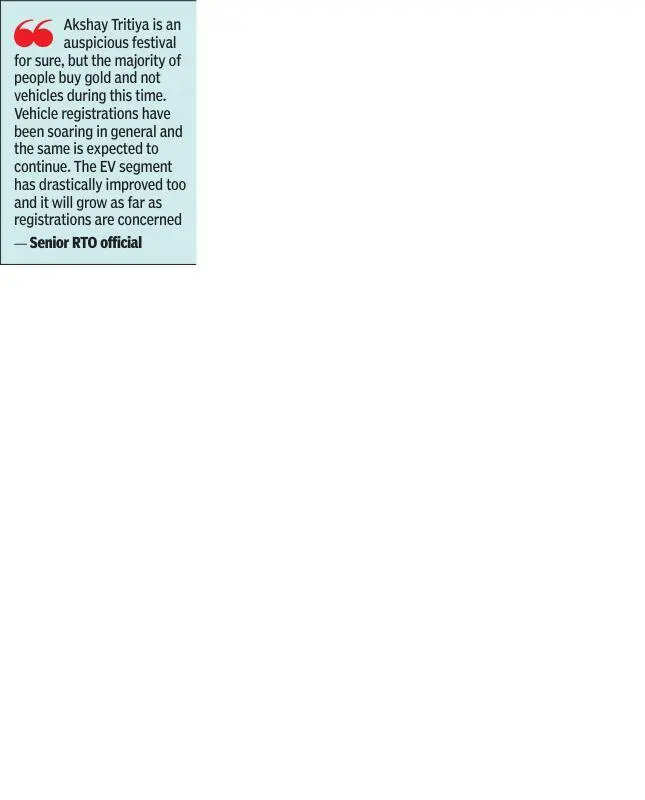 Pune: The regional transport office (RTO) in Pune has seen a drop of 9% in registration of vehicles and 66% of EVs during the Akshay Tritiya week in 2026 as compared to the corresponding festive period last year, said figures released by the office.This year, 7,579 regular vehicles and 306 EVs were registered between April 12 and 19 as compared to 8,298 and 893, respectively, between April 23 and 30 (Akshay Tritiya period), last year.RTO officials said the number of vehicle registrations in the last financial year was impressive, but there was nothing to worry about this year’s figures. They said buying vehicles during festivals was becoming passé.“Akshay Tritiya is an auspicious festival for sure, but the majority of people buy gold and not vehicles during this time. Vehicle registrations have been soaring in general and the same is expected to continue. The EV segment has drastically improved too and it will grow as far as registrations are concerned,” said a senior RTO official.During Gudi Padwa, this year, regular vehicle registrations at Pune RTO saw a drop of around 10% and 28% for EVs. While in 2025, 13,190 regular vehicles and 2,124 EVs were registered, the same stood at 11,937 and 1,530, respectively, during the festival in 2026.“People buy new vehicles through the year now. Personal vehicles have become important owing to constraints in the public transportation system in the city. In such cases, people don’t wait for festivals to buy vehicles. It is proved by the fact that registrations in FY 2025-26 were far bigger than FY 2024-25,” another official told TOI.In 2025 (calendar year), the total vehicle registrations in Pune stood at 3.3 lakh compared to 3 lakh in 2024. In FY 2025-26, vehicle registrations stood at 3,45,455 against 3,04,610 in FY 2024–25. There was a major spike in EV registrations too.Nitin Kulkarni, a working professional and resident of Kothrud, said, “I bought a two wheeler a month ago as waiting for a festival would be too long. We take new vehicles to temples for auspicious reasons, anyway. My sister has taken my old two-wheeler to commute to and from college. Hence, I needed to buy a new one urgently to go to office. In Pune, using public transportation is difficult, costly and unreliable.”