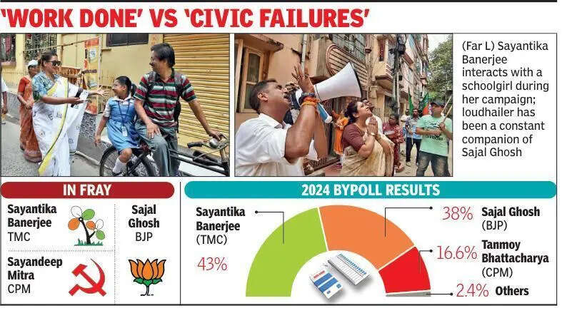 Kolkata: Baranagar has emerged as one of the most closely watched contests, with Trinamool candidate Sayantika Banerjee and BJP nominee Sajal Ghosh fighting a prestige battle in a constituency that went to a byelection just a couple of years back. In that bypoll, Banerjee defeated Ghosh by 8,150 votes. Barely one-and-a-half years later, both candidates have returned to the ground, all guns blazing.On Friday morning, Banerjee began her campaign early in Ward 26 and at one point, she ran through a lane off Moiradanga Road. Asked about her pace, Banerjee said: “It’s not that I am in a hurry to cover more area. I devote maximum time to interact with people, listen to their problems, and solve them. But if voters see that their candidate is physically fit and energetic, they also feel energized to vote.”Later in the day, Ghosh campaigned in adjoining areas, also going door-to-door and appealing directly to residents for support. “Give me a chance. If I fail to deliver, replace me after five years. In last 50 years, you have seen the Left and Trinamool regimes. Please allow the BJP to serve you,” he appealed.While Banerjee projected confidence about retaining the seat, she acknowledged that several civic issues remained unresolved. “I never claim that I did everything within the brief period I served. My first focus was to repair streets, and that was done by spending Rs 7.5 crore,” she said.Ghosh challenged that claim, pointing out that the reality was very different as streets were in disrepair. According to him, sewerage problems, lack of purified drinking water, drainage bottlenecks and waterlogging remained major concerns in the constituency. “I gave Banerjee a tough fight in the bypoll but false voting helped Trinamool then. This time, the ruling party would not get that opportunity,” he said.Banerjee, while admitting that water-related problems persisted, argued that the situation improved compared with the Left Front era. She also raised concerns over deletions during the SIR process. Baranagar, once a Left bastion represented for two decades by former chief minister Jyoti Basu, shifted to Trinamool in 2011. In the 2024 bypoll, Left candidate Tanmoy Bhattacharjee secured around 23,000 votes. While Ghosh said he was confident of attracting Left voters this time, Left candidate Sayandeep Mitra claimed committed Left supporters would remain with his party. He accused Trinamool of neglecting development over the past 16 years and alleged that industries and well-known state-run schools have shut down during this period.Banerjee dismissed the criticism, saying, “They should look at themselves and what development they carried out during their tenure. People know how much development they did.”
