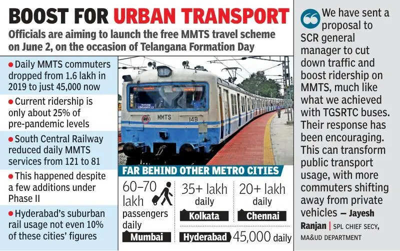 Hyderabad: After the rollout of free bus travel for women across the state, Telangana govt has now decided to extend a similar benefit to the city’s MMTS train services. If this plan goes through, Hyderabad will become the first city in the country to provide free travel on local train services. However, unlike the RTC benefit, which is restricted to women, the free travel will be for all passengers.As part of the move, the state has formally written to South Central Railway (SCR), seeking approval to allow passengers to travel free on the suburban rail network. SCR has responded favourably, in principle, but has asked the state to draft detailed guidelines and sign a memorandum of understanding (MoU) before moving ahead.Officials are aiming to launch the free MMTS travel scheme on June 2, marking Telangana Formation Day. State officials say the initiative was designed to revive the underutilised MMTS network while also easing worsening traffic congestion in Hyderabad.“We have sent a proposal to SCR general manager to cut down traffic and boost ridership on MMTS, much like what we achieved with TGSRTC buses. Their response has been encouraging. This could transform public transport usage, with more commuters shifting away from private vehicles,” municipal administration & urban development department special chief secretary Jayesh Rajan told TOI.Officials believe the proposed scheme could help revive MMTS usage, especially as buses and Metro trains remain overcrowded on working days and road congestion continues to worsen.“Once the state finalises operational guidelines, we will study the proposal, make any necessary corrections, and assess its feasibility. After that, it will be forwarded to the ministry of railways for approval. If the Centre clears it, the plan can be implemented,” a senior SCR officer said.At present, Telangana govt provides free bus travel under the Maha Lakshmi Scheme, which covers women, girls and transgender passengers. Under this system, RTC issues zero-value tickets, indicating the journey details, and the govt reimburses the fare. A similar model is likely for MMTS, where SCR would issue tickets without charging passengers, later billing the state based on ridership data. Current, MMTS fares typically range between 5 and 15 based on the destination.MMTS trains currently run on Ghatkesar-Lingampally-Ramachandrapuram, Umdanagar-Medchal, and Hyderabad-Lingampally-Umdanagar routes. Around 88 services operate daily, carrying roughly 40,000 to 45,000 passengers. Before the pandemic, the network used to handle close to 1.6 lakh commuters across nearly 120 services. However, ridership has dropped significantly due to expansion of Metro rail and the availability of free bus travel.