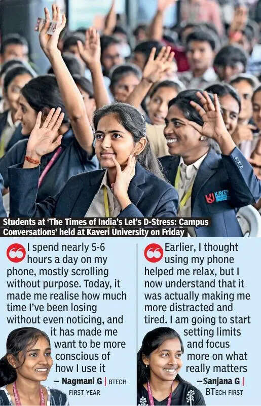 Hyderabad: Digital addiction is not just about being hooked to screen, but a gradual loss of control over attention, where minutes slip into hours without awareness, said Dr Jawaharlal Nehru, psychologist at Tele Manas, at ‘The Times of India’s Let’s D-Stress: Campus Conversations’ held at Kaveri University on Friday.“We open apps such as Instagram without purpose, keep scrolling, and by the end of it, we gain nothing except mental fatigue,” he said. Addressing students immersed in tech-driven learning environments, the session unpacked the deeper patterns behind excessive screen use. Alongside RJ Nani who moderated the discussion, Dr Nehru highlighted how digital behaviour today is often driven by the ‘Fear of Missing Out’ (FOMO), where individuals feel compelled to stay constantly connected despite limited real benefit.“Your mind is not tired because of work; it is tired because it never gets rest. You keep feeding it random content — videos, alerts, distractions — and it never settles,” he explained, pointing to the cognitive overload caused by continuous scrolling.The session also emphasised that the issue stems more from mental boredom than physical exhaustion. “When individuals lose interest or direction, the mind instinctively seeks distraction, leading to constant app-switching and reduced focus. Over time, even small habits, checking the phone repeatedly for a few minutes, accumulate into significant loss of productivity,” he added.He shared that the real threat is not the digital world itself, but what individuals allow into their minds. He encouraged students to build awareness around their screen habits, prioritise meaningful engagement, and treat technology as a tool rather than a distraction. He reinforced that discipline and clarity are essential for sustained focus and personal growth.Welcoming the initiative, Harsha Polsani, director of student welfare, Kaveri University, said, “We see students constantly balancing academic demands with digital exposure. Building a mindful relationship with technology is no longer optional; it is essential for maintaining both focus and creativity.” “Initiatives like this help students pause and reflect on their habits. The goal is not to avoid technology, but to use it with intention, so that it supports learning rather than distracts from it,” he added.